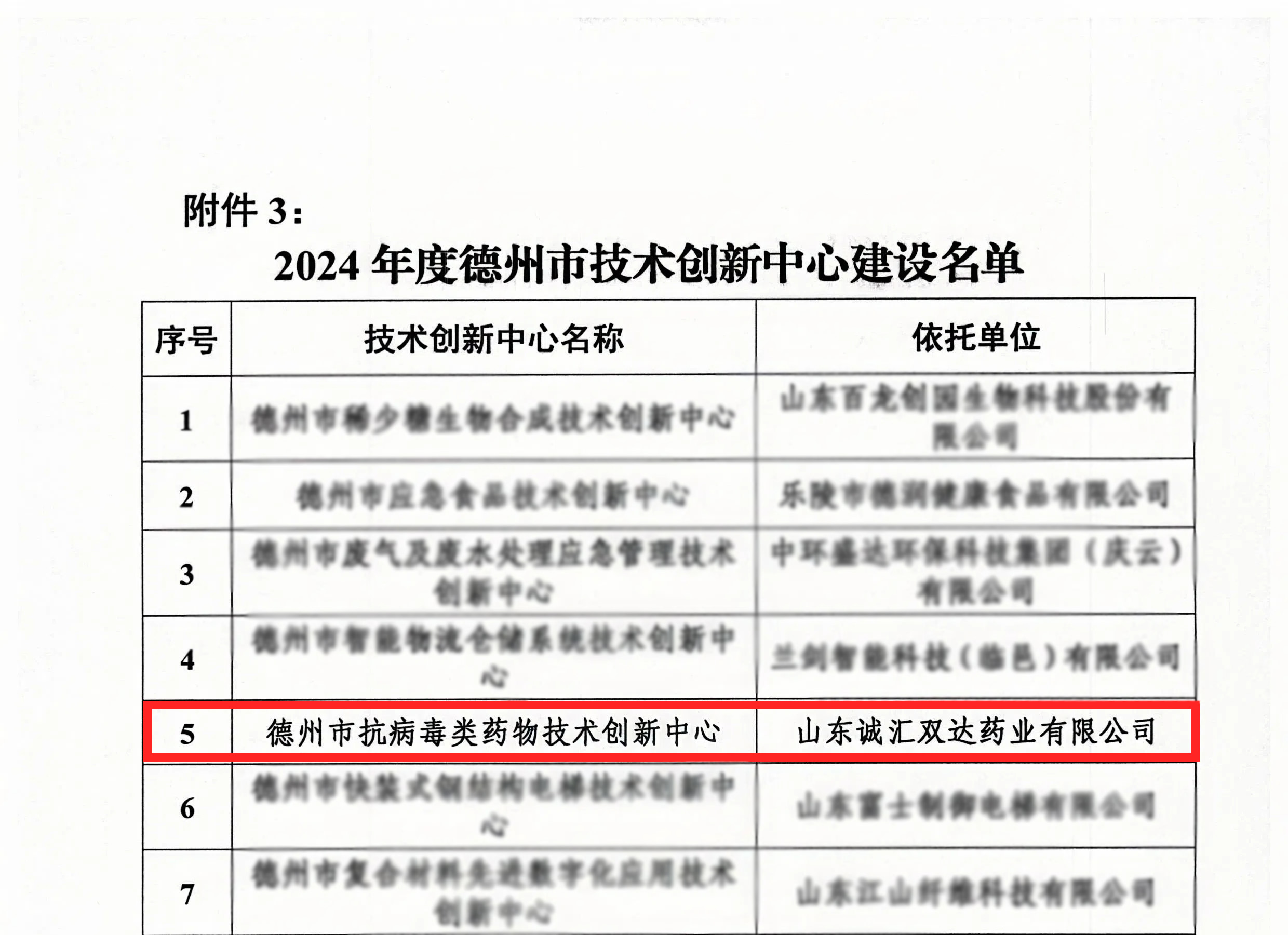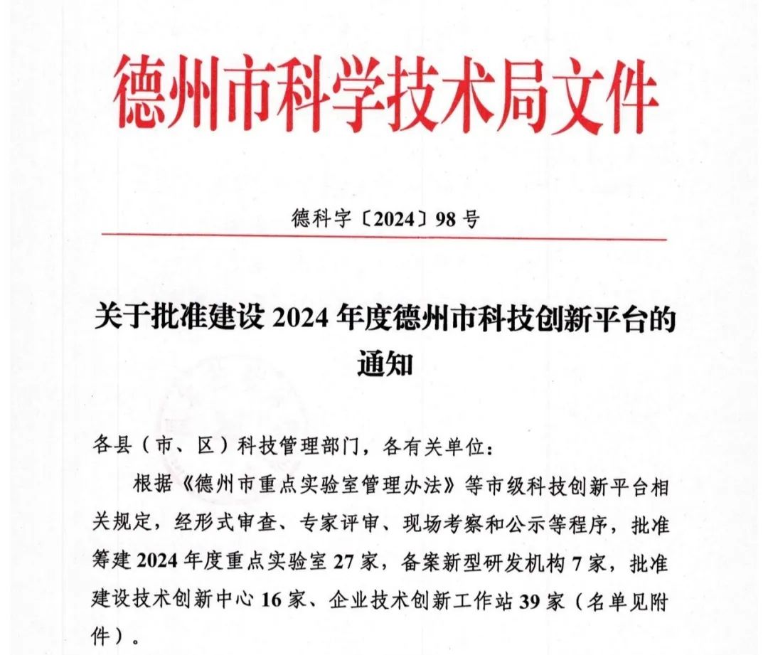 Recently, Dezhou Science and Technology Bureau issued a ‘notice on the approval of the construction of the 2024 annual Dezhou Science and Technology Innovation Platform’ Deke word [2024] No. 98, the construction of the list, our company declared the Dezhou antiviral drug technology innovation centre successfully selected, this good news is not only the company's technology research and development and innovation capabilities, but also the incentive for the future development of the ChengHuiShuangDa Pharmaceutical incentive and encouragement.
